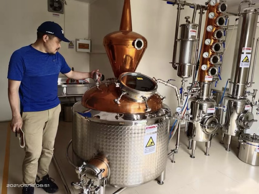 李大哥带我们看了他的这套酿酒设备,特别炫酷,蒸馏釜是纯铜材料,而且过滤塔经过6道精滤,能有效清楚杂醇,杂醛和一些苦涩的单宁物质。我以前以为这样的设备只能酿造威士忌等洋酒,后来我还特地找厂家咨询过,这套设备,白酒,威士忌,都不在话下的。在前面我品尝过这套设备的白酒,因为是新酒比较冲,一般吊烧的苦尾倒是确实没有。而李大哥通过这台设备酿造的鸿酒,基本是我每餐必喝的开胃酒。实在太好喝了。