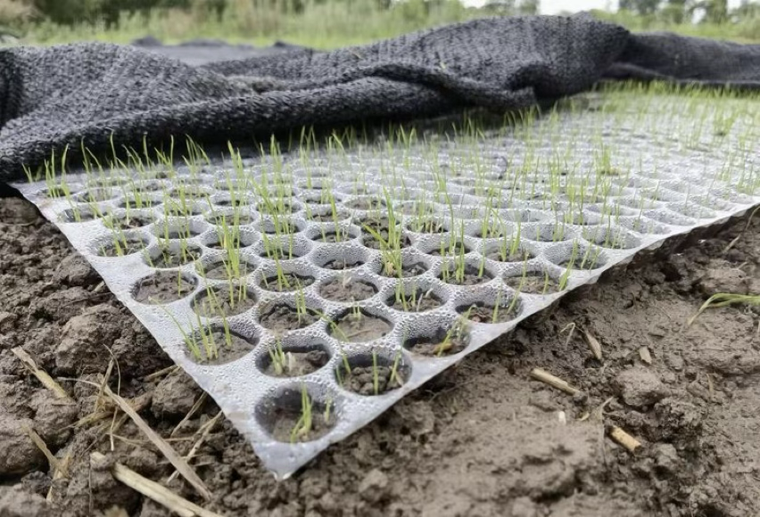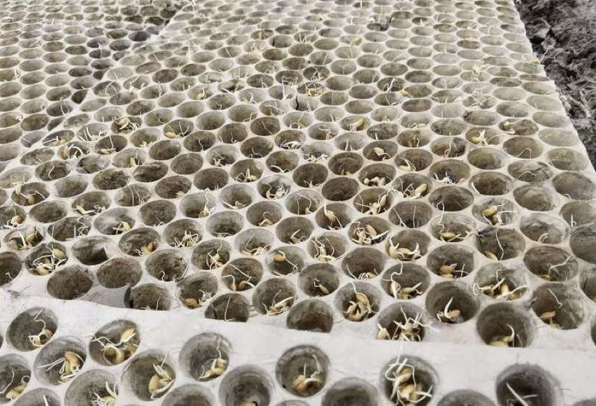 种子撒在育秧盘中,犹如蜂巢里面的蜜蜂,万头攒动,每个凹坑里面的种子保证有5-8颗左右,然后上面再撒一些黏土颗粒覆盖,提供营养并定根。