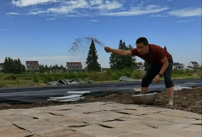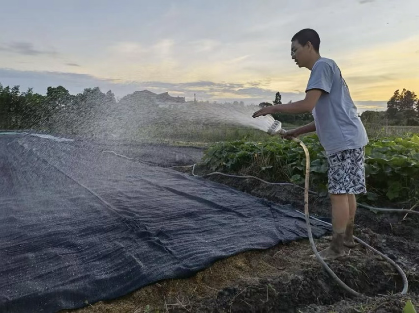 撒完土后我们用遮阳网做了下防护,主要是为了放置鸟儿偷吃种子,再者也减轻洒水的次数和劳力。后面就不定时的洒水等待秧苗快快长大。