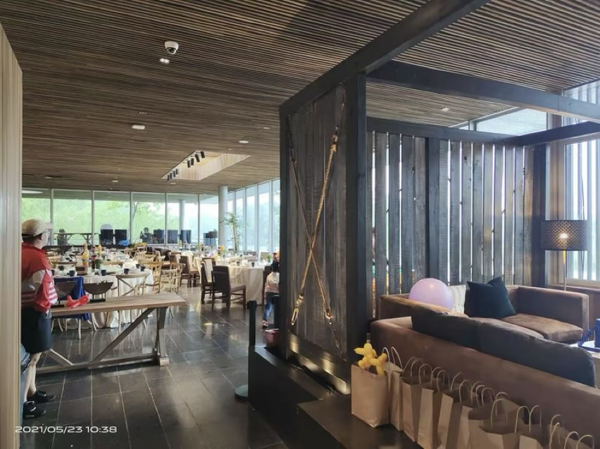 茶歇舫正确的名字应该叫采摘亭,经查是又北京直向设计事务所设计的,其竖向竹木格栅和玻璃墙面的组合,让建筑的垂直界面象一层薄纱一样半透明,农场的景物和远方的天际线在其后方若隐若现。建筑空间地坪和周遭自然地面相切,仿佛是建筑和大地最轻微的触碰。整体建筑形态和空间所呈现的安静、轻与纤细、通透和灵动,与江南地域文化气质特征相吻合。