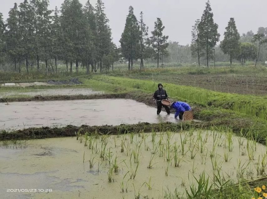 阿汤哥知道我对水稻栽培兴趣浓厚,带领我直奔水稻试验田,在经过一块水稻田时,我看到两位农友在田地里用筛子筛选东西,很是好奇。难道是要筛选沙子?一经询问才知道是为了打捞水田里面的绿藻(阿汤哥口中的“水绵”)。水绵俗称青苔,属绿藻门接合藻纲水绵科。水绵属植物,生殖方式通常为营养繁殖和有性繁殖两种类型。营养繁殖时,丝体受到机械损伤或其他原因断裂成若干短丝,通过细胞分裂伸长变成较长的丝状体。水绵以成片丝体越冬存活,是次年的初侵染源,灌溉水是次生侵染源。在5月上旬丝体、绿色部分开始生长繁殖,先期为絮状,后期为片状,至6月初为连片危害,磷素化肥有利于其繁殖生长。水绵对水稻的危害主要是影响地温、争夺营养,表现为分蘖减少、根系发育不良、根少、根短,严重限制了根系的吸收能力;植株矮短,穗小、粒少、粒重下降,严重时可造成早衰。对水稻产量影响十分突出,生产上必须掌握最佳防治时机,因为灌溉水是次生侵染源,所以首先应消除沟渠中的水绵是减少其在本田发生的主要措施。