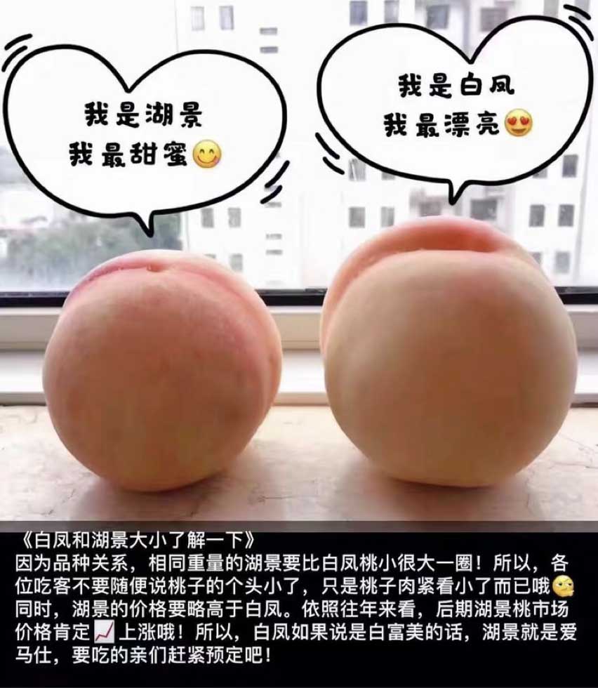 盛老师看到我的美篇后,特地帮我勘误了几个地方,另外还帮我找了白凤和湖景的大小重量外观等区别,特别强调:白凤口味清甜,像白糖水,湖景口味蜜甜,像蜂蜜水。对此深表感谢。