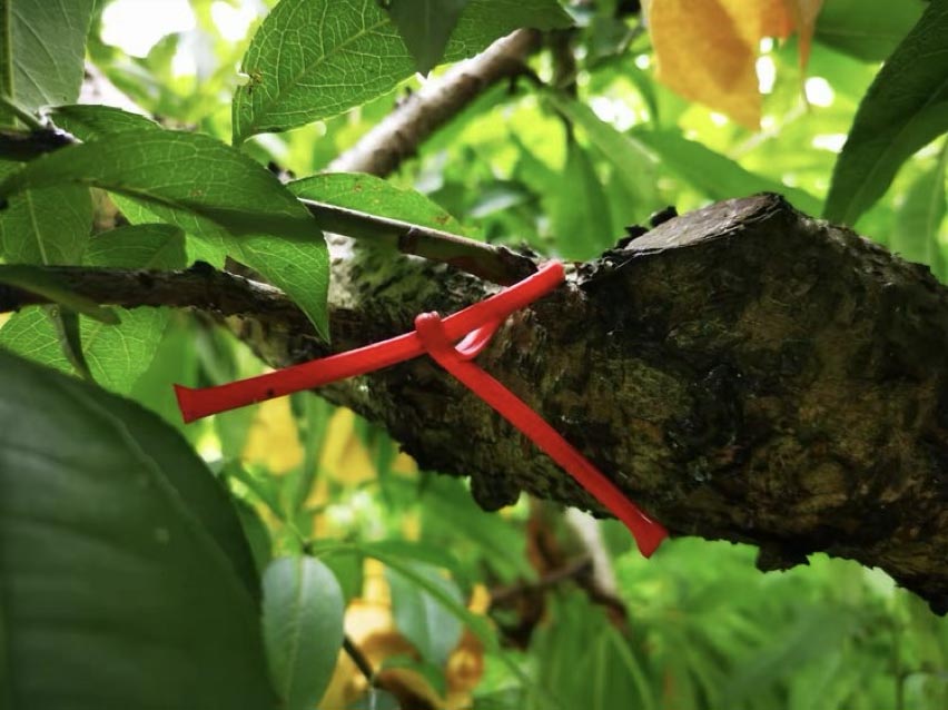 走过桃园,看到桃枝上到处都绑满了小红绳,很是好奇,难道这就是传说中的月老牵线?问了才知道这是一种生物驱虫法,红带学名叫迷向丝(又称性诱剂迷向散发器),其内含高浓度的性诱剂,其原理是利用散发出来的性信息素干扰梨小雌雄虫间的交配通讯联系,最大限度地降低成虫交配率,减少繁殖数量,起到干扰和诱捕的双重作用,以达到防虫目的,是一种高效、绿色、环保的防治梨小食心虫的方法。