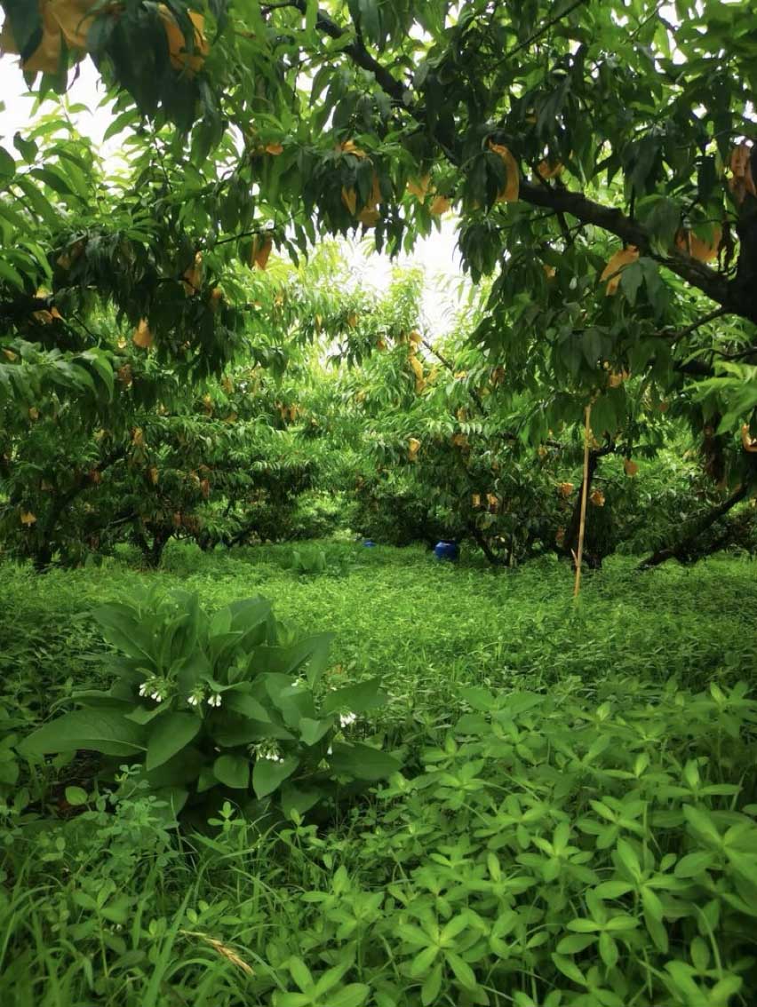 当我们走进园子,你简直不敢相信眼前的场景,满园的绿草郁郁葱葱,这哪里是桃园,不就是菜园子吗。也许在你的印象中,果园就应该整齐划一,地面不能有杂草,不然这些草分享了果树的营养。这不就是懒人种法吗!园主盛老师看出了我的疑问,开始娓娓道来这有机种植方法,所有的有机种植都不能使用化学肥料。必须要学会堆肥,学会种植绿肥,以及掌握绿肥还田。