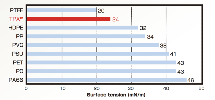 由于TPX具有很低的表面张力,仅有24mN/m,这甚至比一些氟树脂低,与其他材料相比,TPX具有极好的易剥离性。