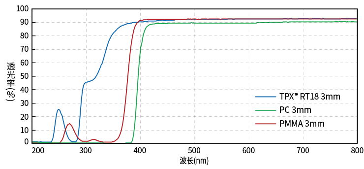 TPX的折射率仅1.463 n D20 ,低于氟树脂或其他透明树脂。所以,要求低折射率的材料时,TPX是最好的选择。